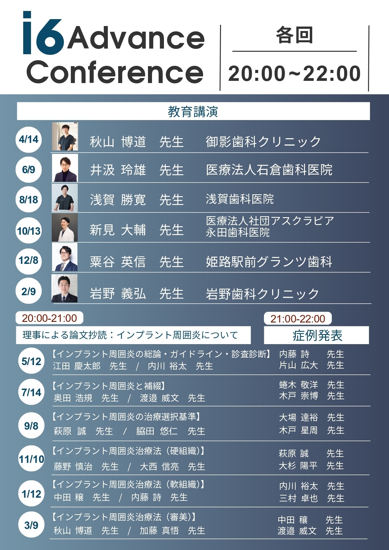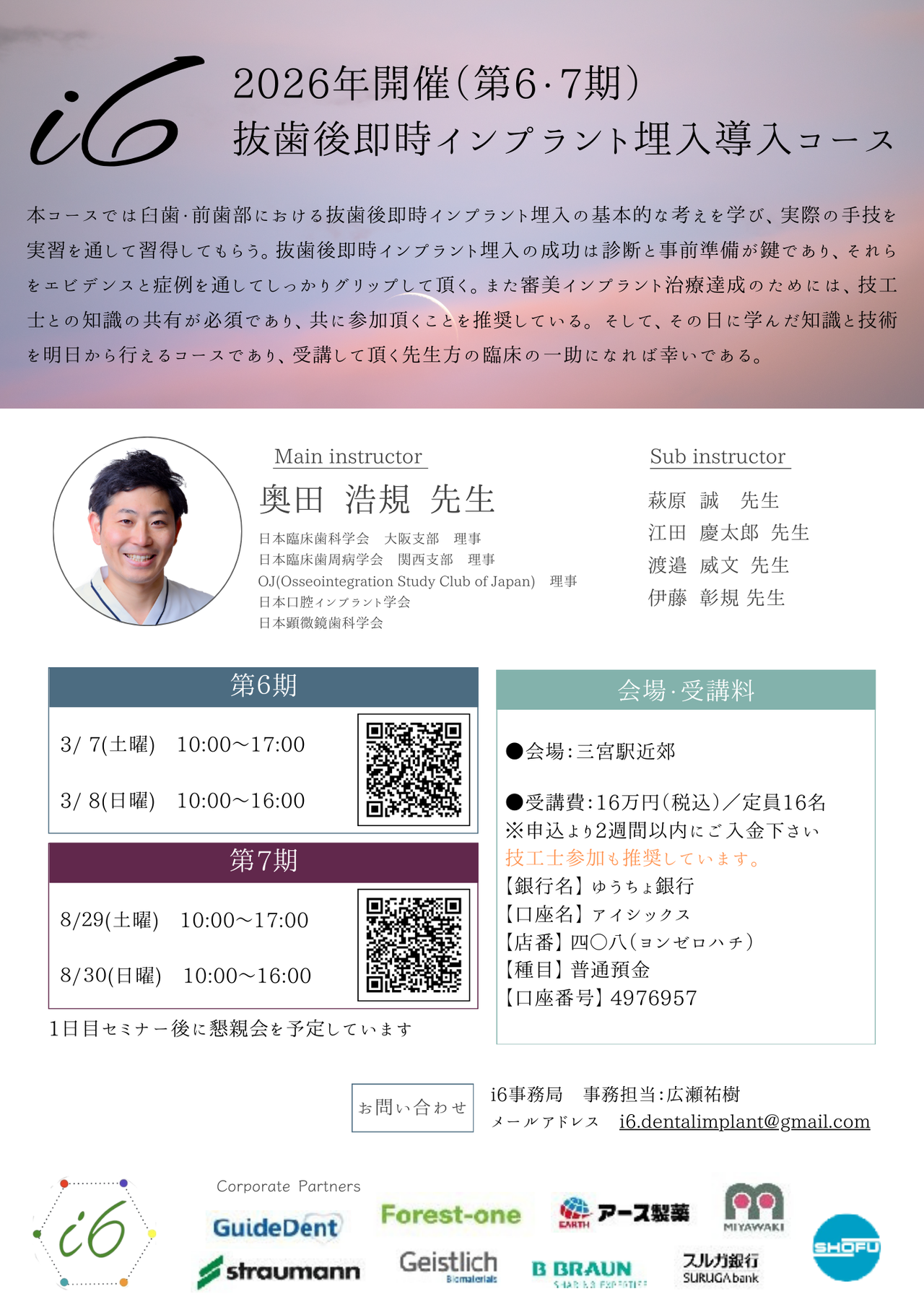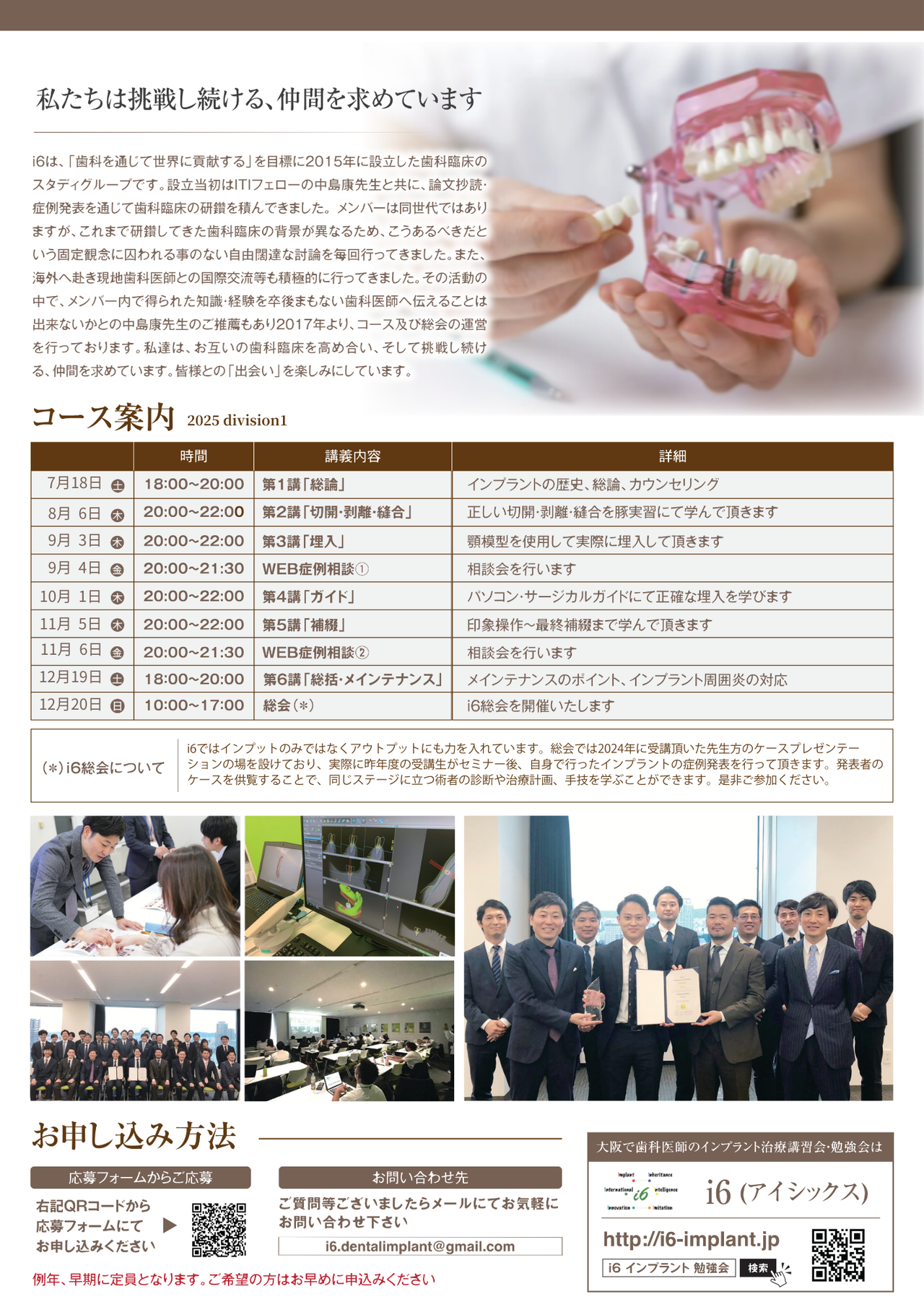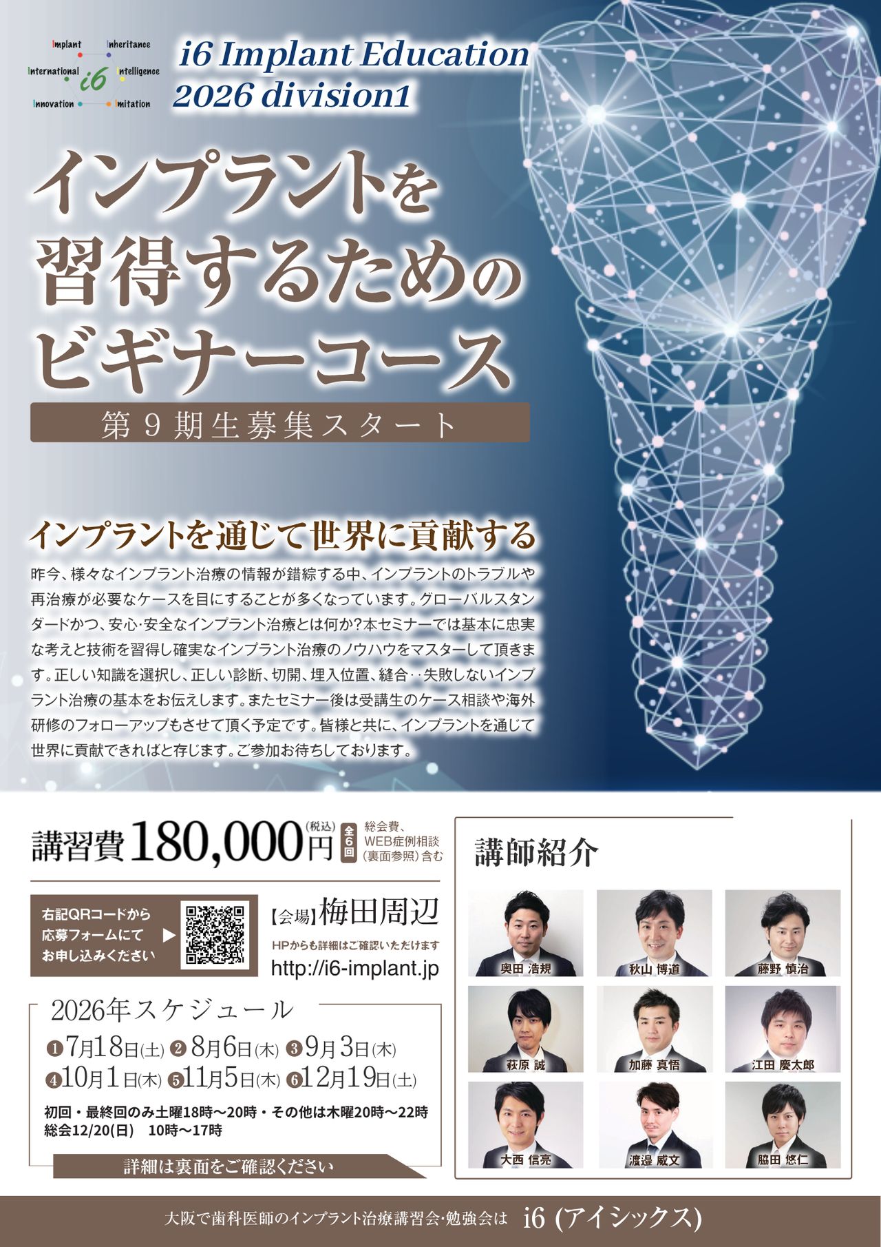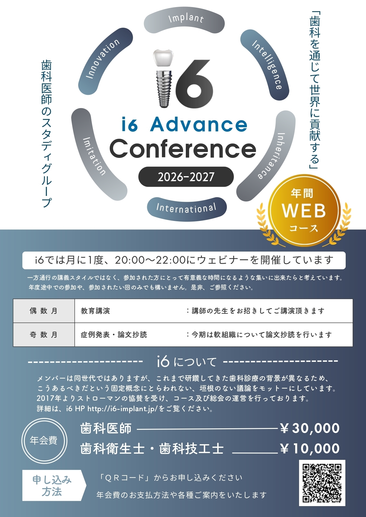 歯科医療の基本を準拠し、確実な治療計画、インプラント治療、メインテナンスを患者さんと共に話し合い、愛される歯科医師になって頂くため、i6のメンバーと若手の先生方との情報交流が大変効果的であると思います。